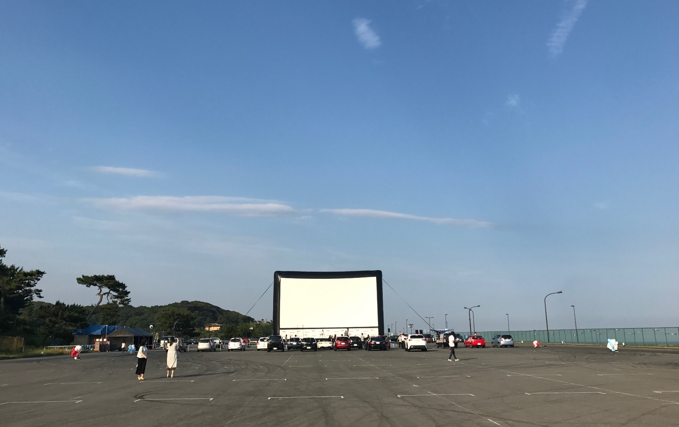 カーラジオから流れる音声と、大空を背景にした大画面での屋外上映。